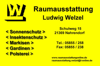 Firma: Raumausstattung Welzel Kategorie: Meisterbetrieb Inhaber: Ludwig Welzel Standort: 21369 Nahrendorf Gründung: 1948 Mitarbeiter: 2
